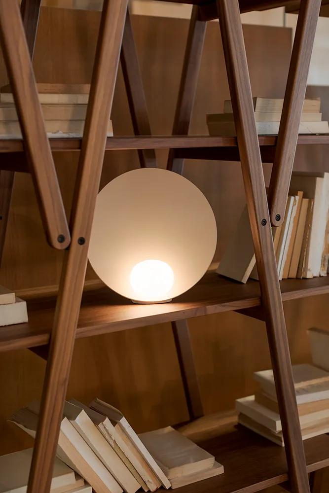 A delicate and elegant design where an interaction is established between the light emitted by the small opal blown-glass sphere and the light reflected by the dish that embraces it.