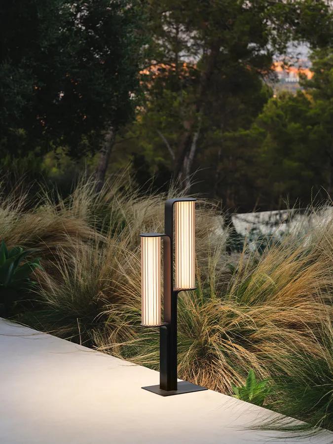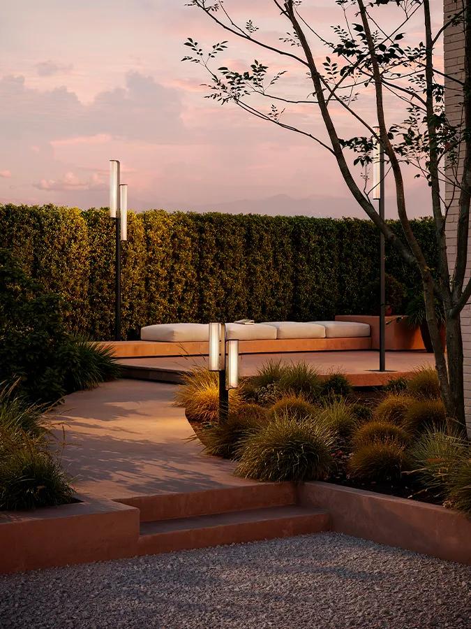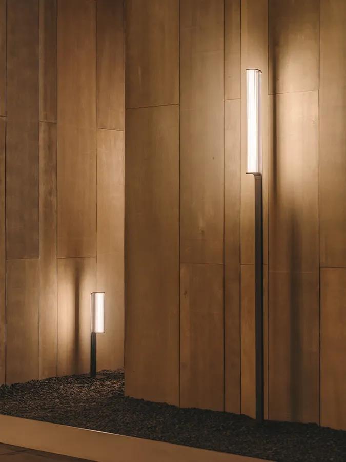 En lugar de integrarse silenciosamente en el jardín, la lámpara de pie para exterior Class se alza elegante y orgullosa, y su luminaria cilíndrica de vidrio irradia una luz suave y difusa. La tira de luces LED con control de atenuación está encapsulada dentro de cada tubo.