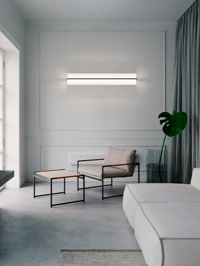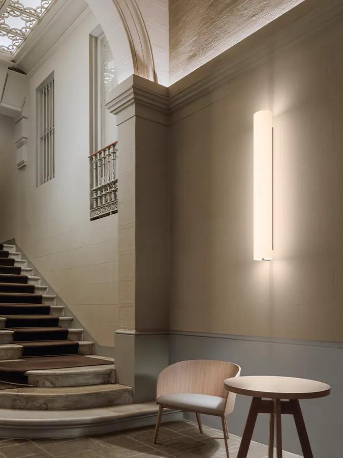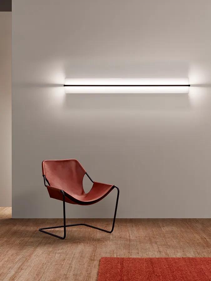 Su estructura lineal, equipada con tecnología LED, alberga un difusor de vidrio opalino soplado o un reflector metálico curvado, ofreciendo dos experiencias lumínicas distintas. En versión de vidrio, proyecta un resplandor cálido y envolvente que ilumina en 360 grados; en su versión metálica, evoca una lluvia luminosa descendente, creando atmósferas teatrales y expresivas. Disponible en diferentes tamaños, el aplique Kontorno combina sobriedad geométrica y poesía visual, adaptándose tanto a proyectos residenciales como a espacios profesionales.
