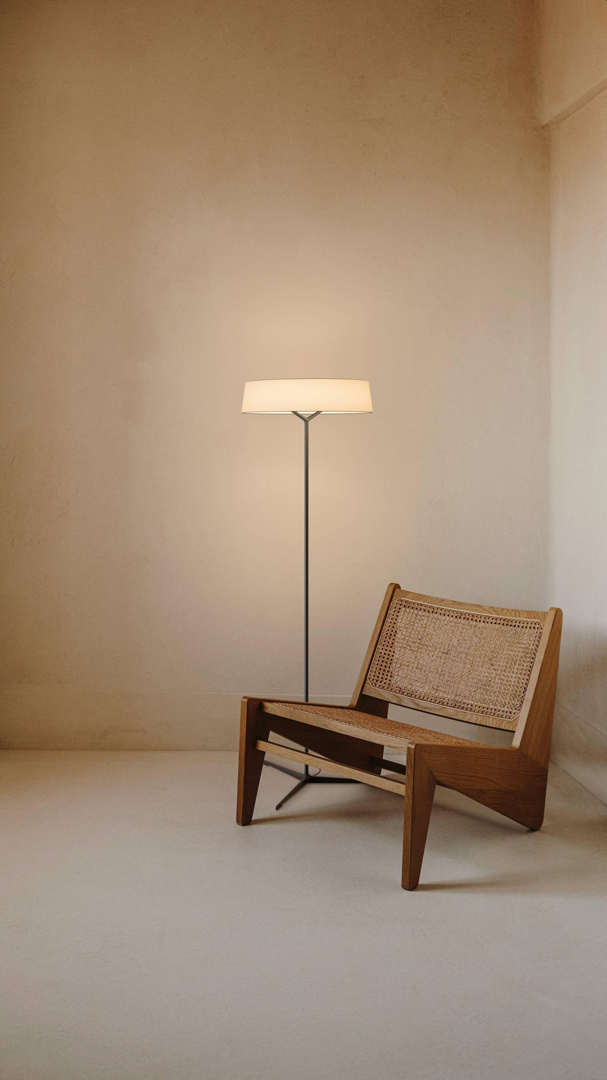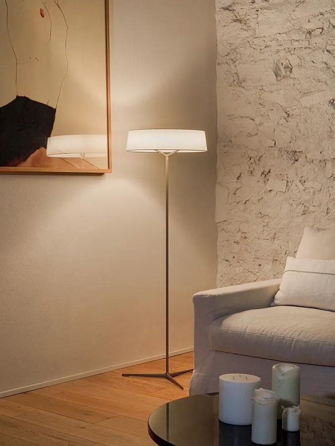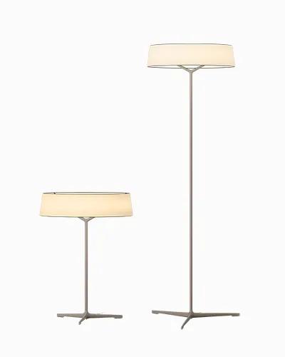 Nella lampada da terra e da tavolo Dama, il paralume cilindrico poggia saldamente su un elegante stelo in alluminio che si ramifica in tre gambi disponibili in due raffinate finiture.